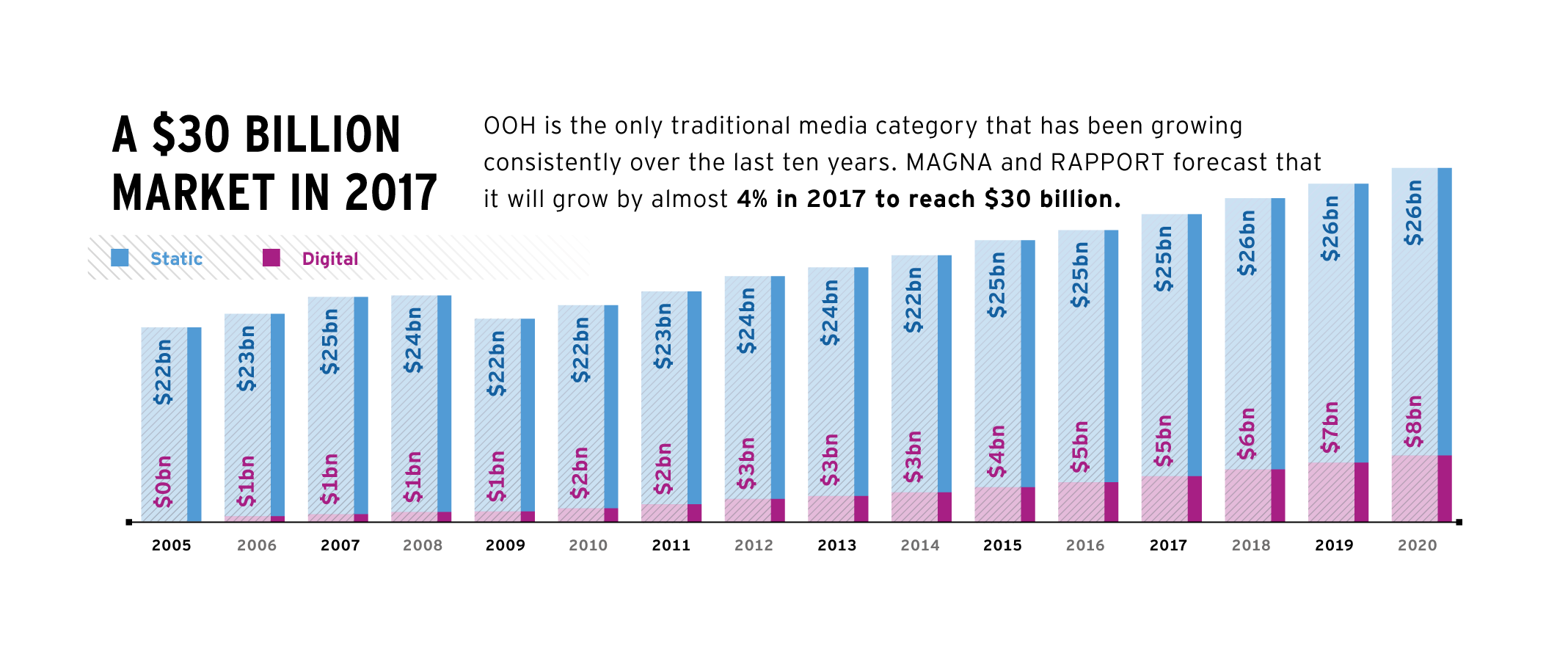 Der Gesamtumsatz mit Out of Home Medien weltweit lag im vergangenen Jahr bei $ 28 Mrd. und wird laut Magna und IPG bis 2021 auf $ 33 Mrd. wachsen. Das entspricht einem jährlichen Wachstum von 4%. Zum Vergleich: die deutschen Umsätze für Digital Out of Home sind zuletzt mit jährlich 30% gewachsen.